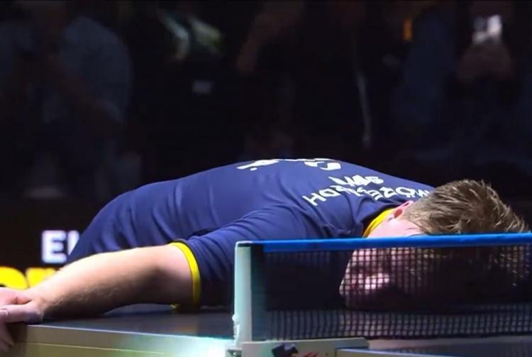 赛后,莫雷加德亲吻球台庆祝这个来之不易的冠军。
