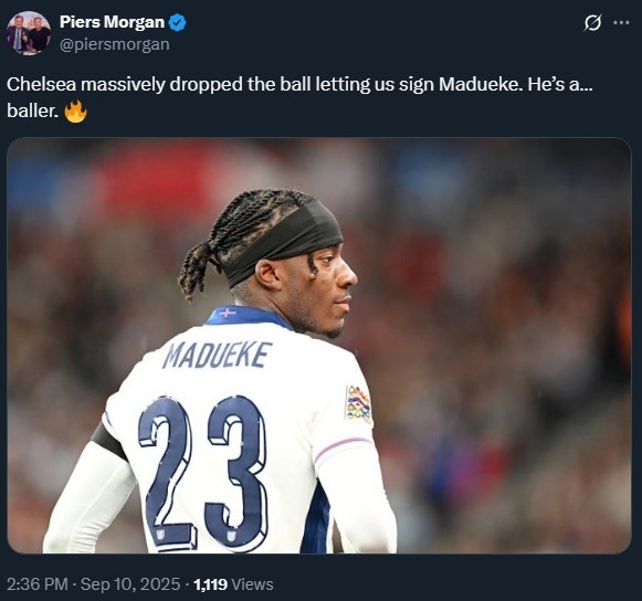 9月10日,英国知名主持人、阿森纳球迷皮尔斯-摩根通过推特发文,盛赞切尔西球员马杜埃凯的表现。